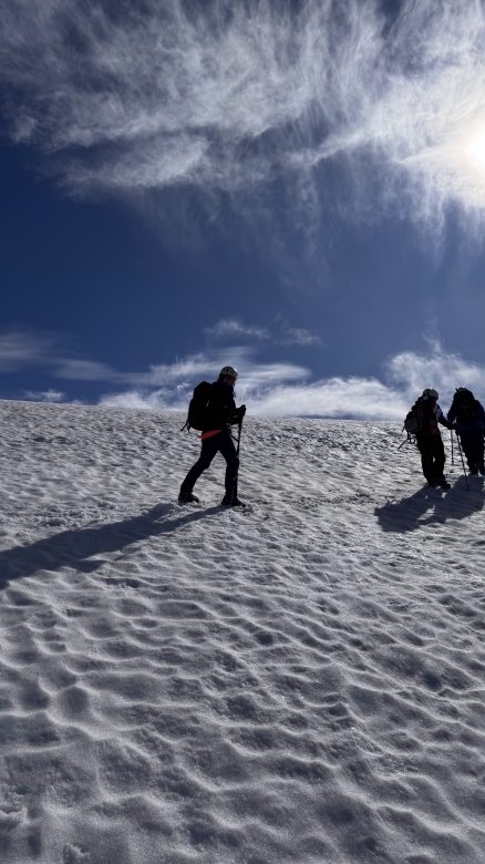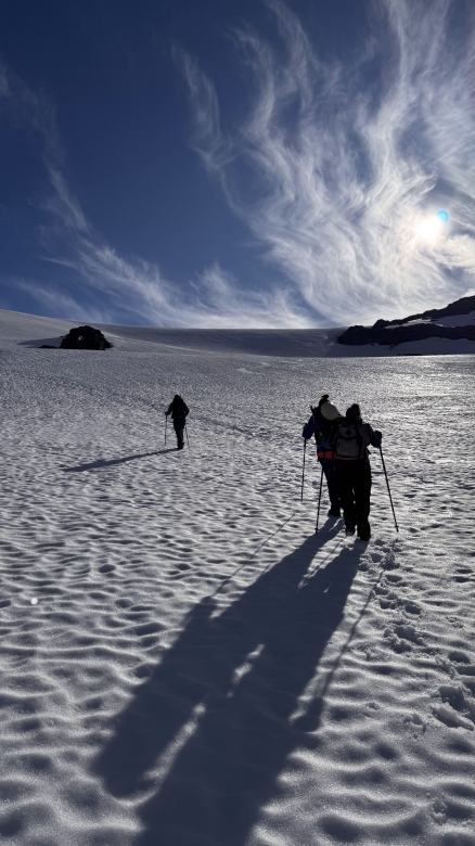 Iniciamos el ascenso desde el refugio recorriendo distintos ambientes: primero atravesamos un bosque andino-patagónico, para luego ganar altura y avanzar por pastizales de altura, zonas rocosas y finalmente el glaciar, donde realizaremos el tramo final de la ascensión.